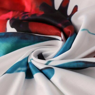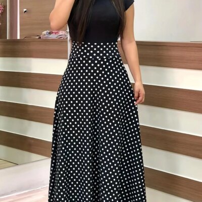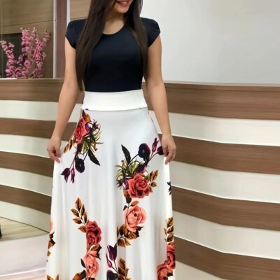 2024 European and American style flower print color matching short sleeved dress for women’s large swing skirt
