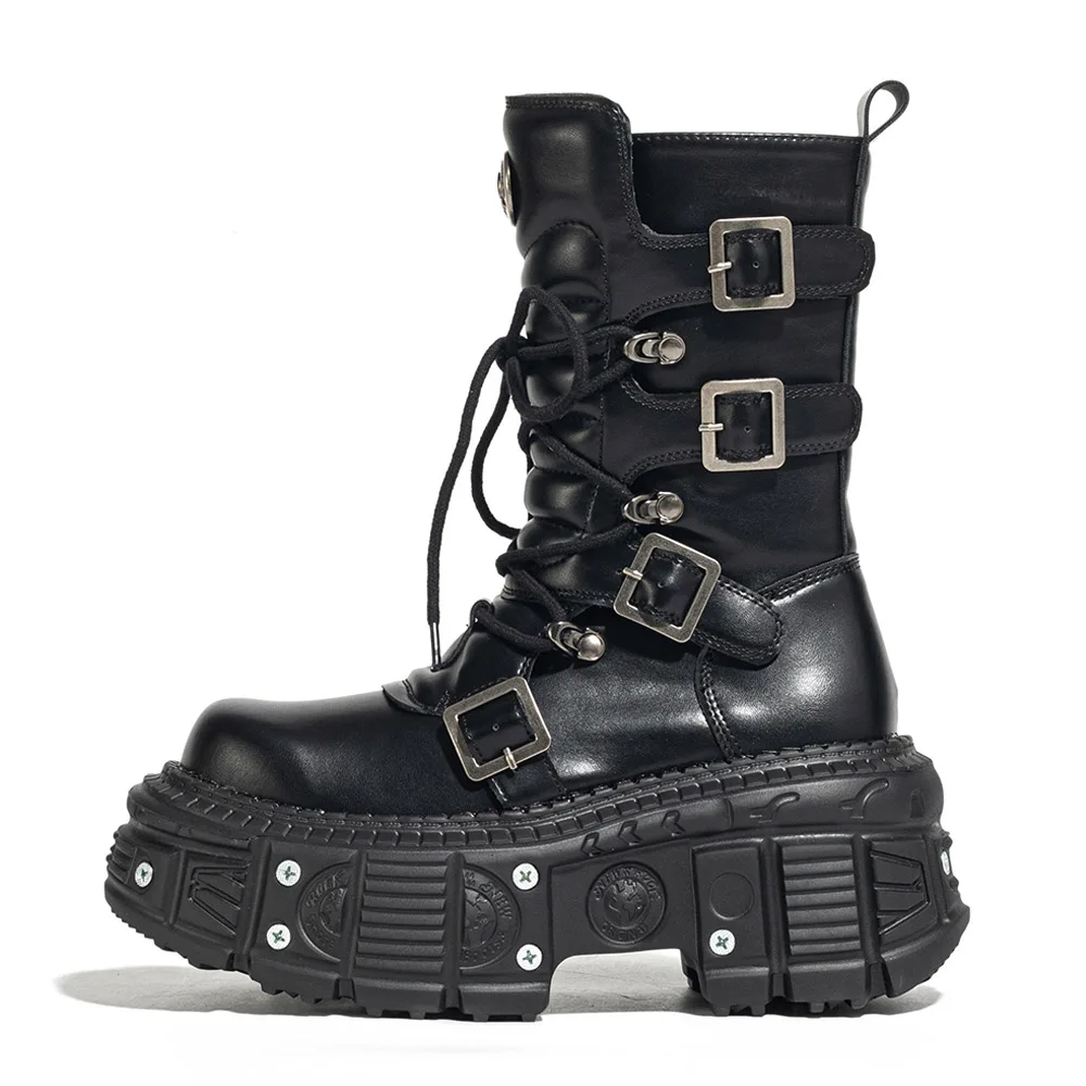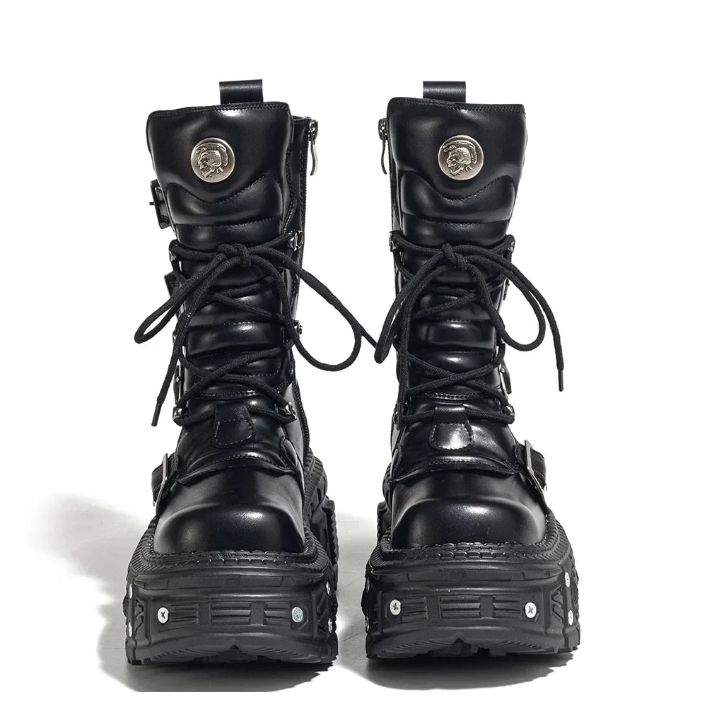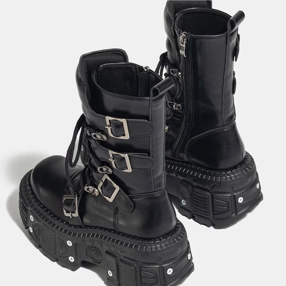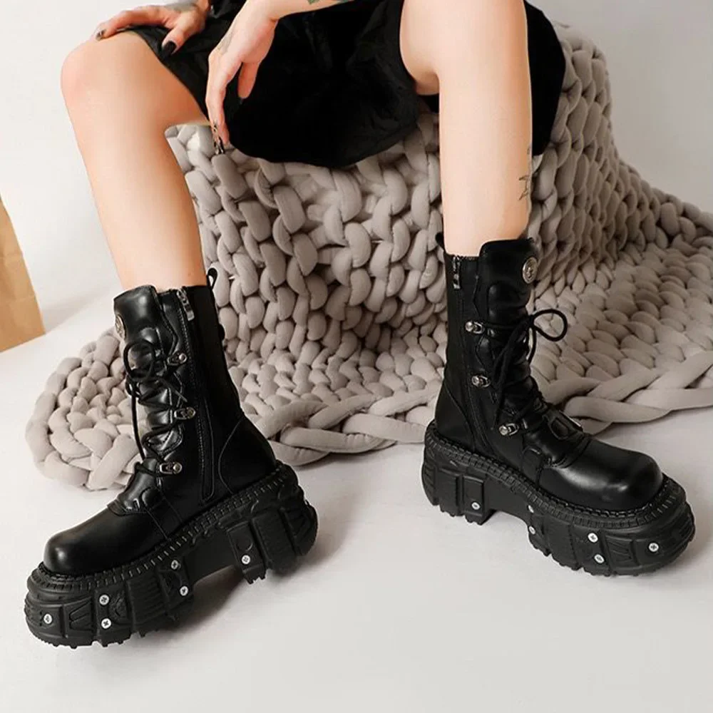 2024 New Punk Style Women Shoes Lace-up Platform Shoes Woman Rock Boots Metal Decor Thick Bottom Street Shot Knight