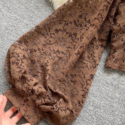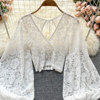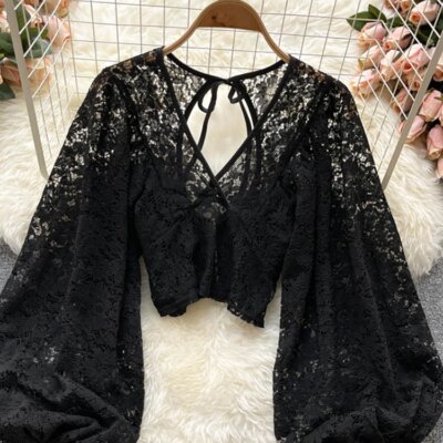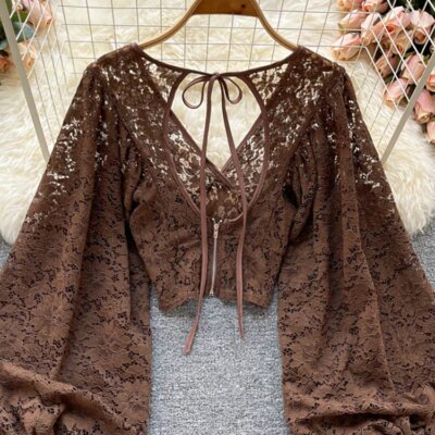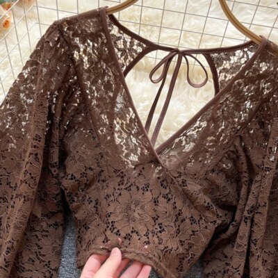 Autumn Black/White/Brown Sexy Lace Blouse Women Elegant V-Neck Puff Long Sleeve Open Back Short Tops Female Party Blusas 2021