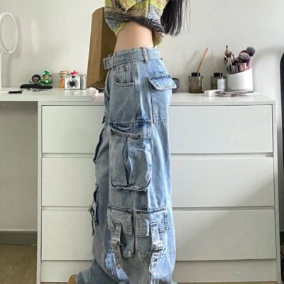 Autumn Winter New Ladies Cargo Jeans American Street Style Baggy Cargo Pants Women Blue Multi-pocket Wide Leg Jeans for Women