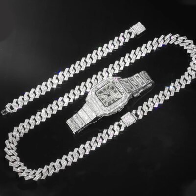 Gold Color Cuban Chain Watch for Men,Hip Hop Miami Curb,Iced Out Paved Rhinestones,Bling Rapper Necklace, Watch+Bracelet Jewelry