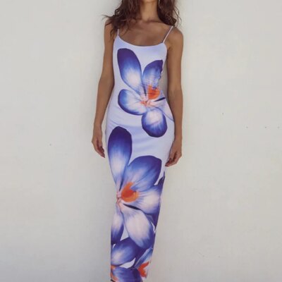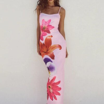 Mozision Floreal Print Long Dress For Women Gown Summer New Spaghetti Strap Sleeveless Backless Bodycon Sexy Midi Dress Elegant