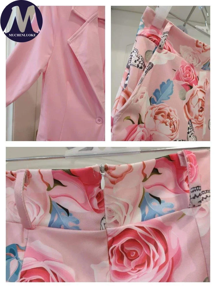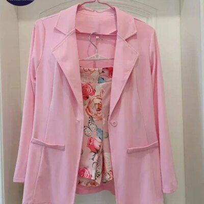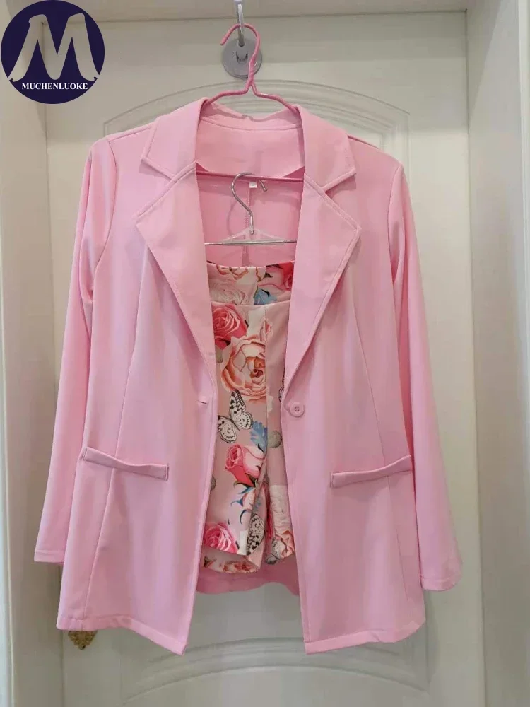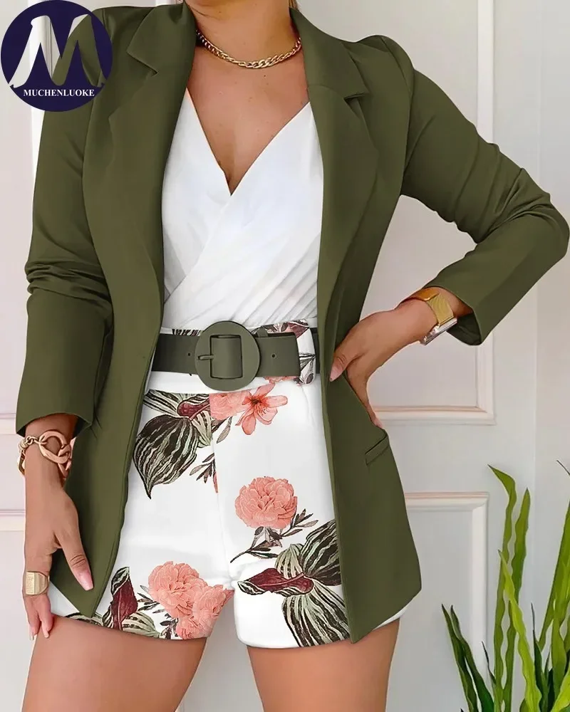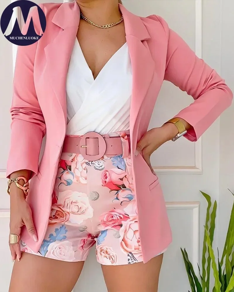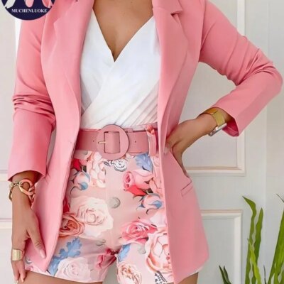 Set Woman 2 Pieces Spring Summer New Korean Fashion Casual Long Sleeve Blazer Coats Suits Elegant Printing Belt Shorts Sets