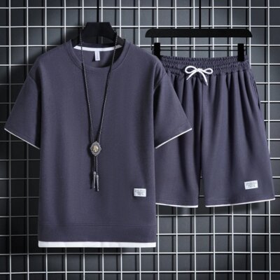 Summer Men’s Waffle Sets Casual T-Shirt And Shorts Set Male Sports Suit Solid Color Tracksuit Loose Suits Size 3XL