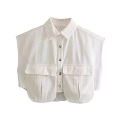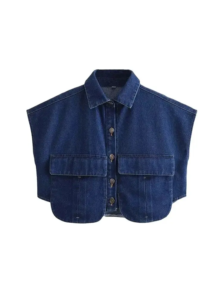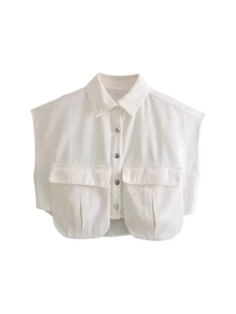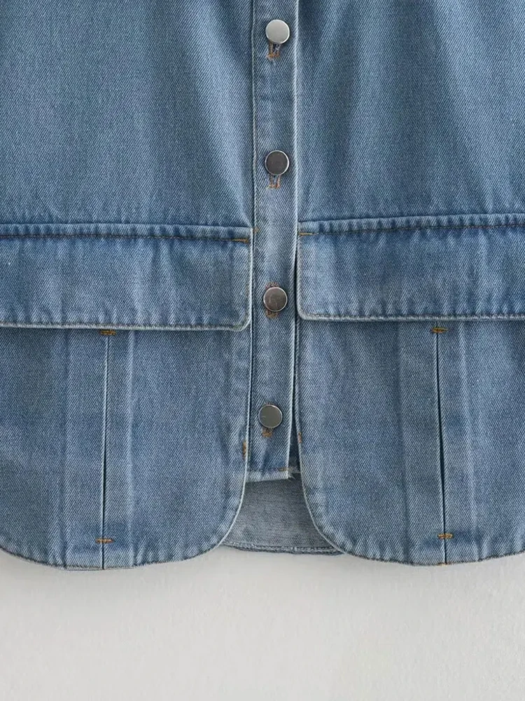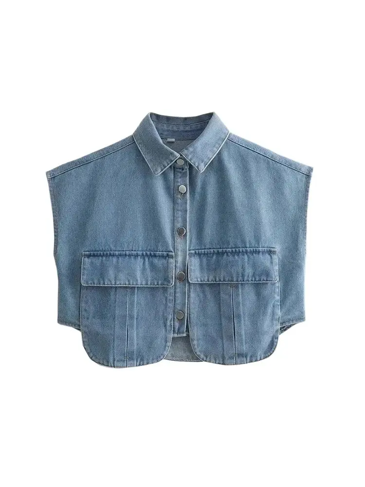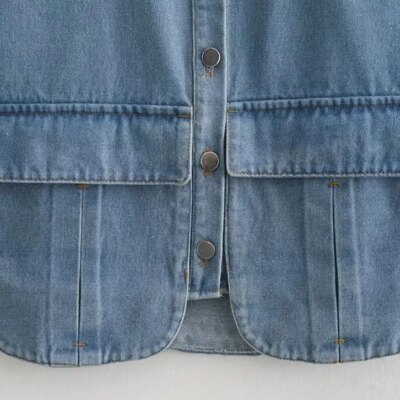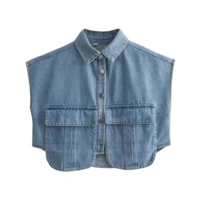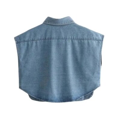 TRAF Women Fashion With Pockets Cropped Denim Shirts Sexy Sleeveless Button-up Female Blouses Blusas Chic Tops