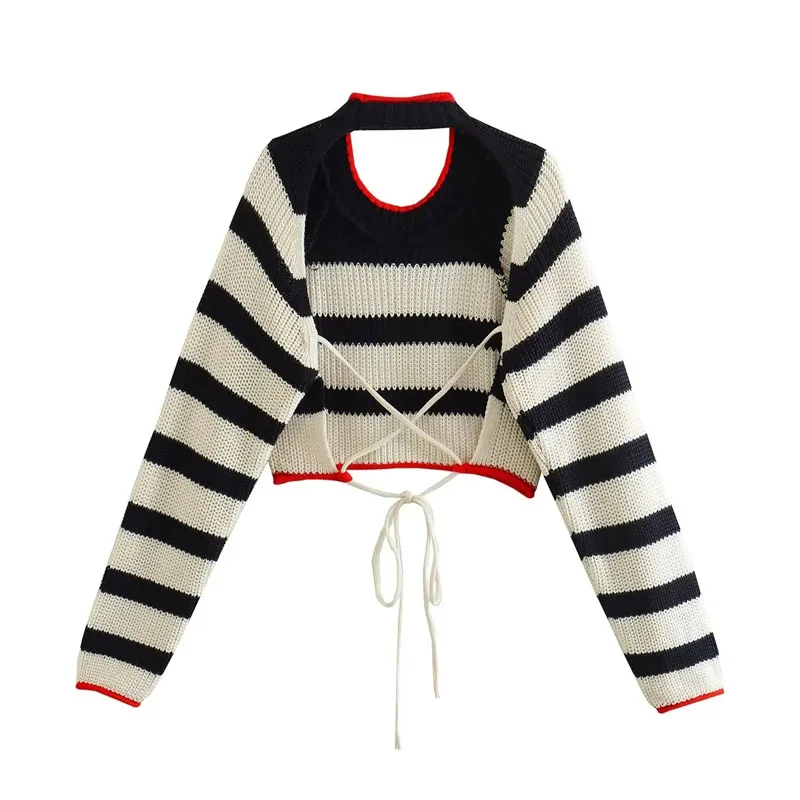 TRAF Women’s Cropped Sweaters Knit Striped Sweater Pullovers Autumn Winter Crop Knit Backless Long sleeve Top Knitwears