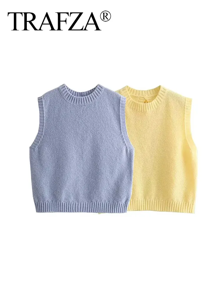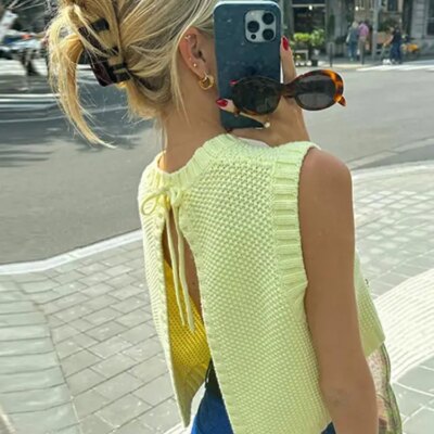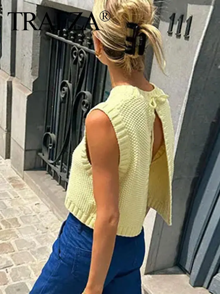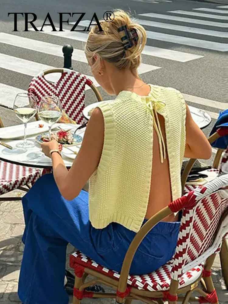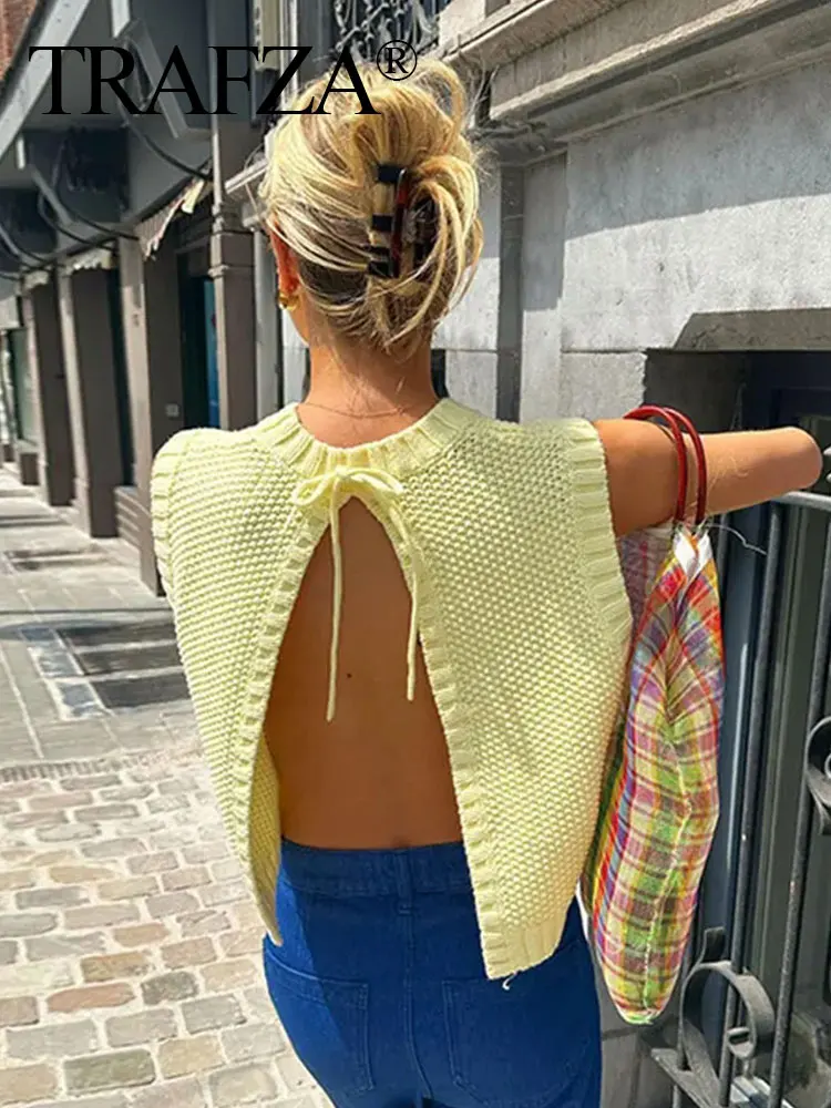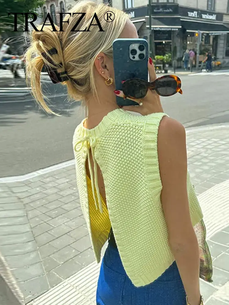 TRAFZA 2024 New Fashion Women's Tank Top Knitted O Neck Sleeveless Lace Up Woman Casual Short Pullover Top Sexy Backless Sweater