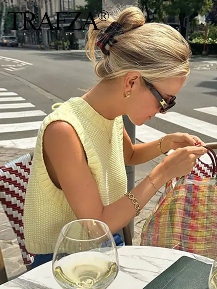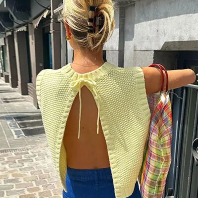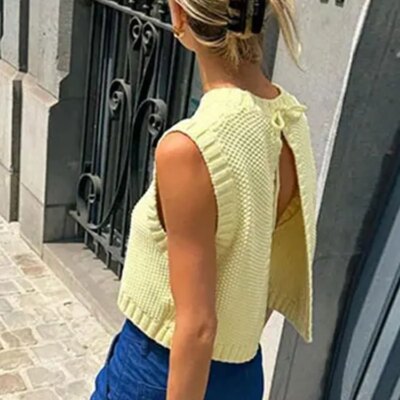 TRAFZA 2024 New Fashion Women's Tank Top Knitted O Neck Sleeveless Lace Up Woman Casual Short Pullover Top Sexy Backless SweaterTRAFZA 2024 New Fashion Women's Tank Top Knitted O Neck Sleeveless Lace Up Woman Casual Short Pullover Top Sexy Backless Sweater