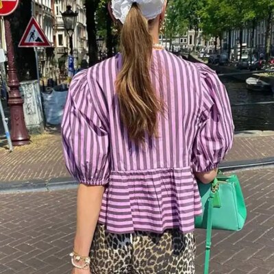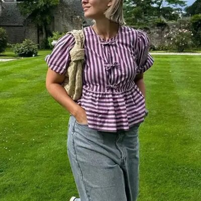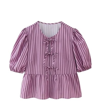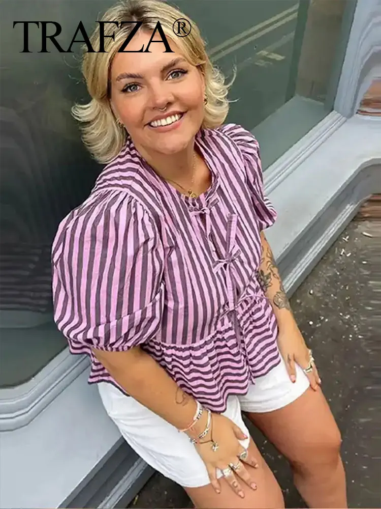 TRAFZA Women Elegant Stripe Bow Lace Up Blouse 2024 Fashion Short Sleeve Loose Shirt Female Spring Summer Vintage Chic Tops