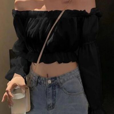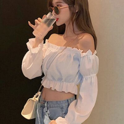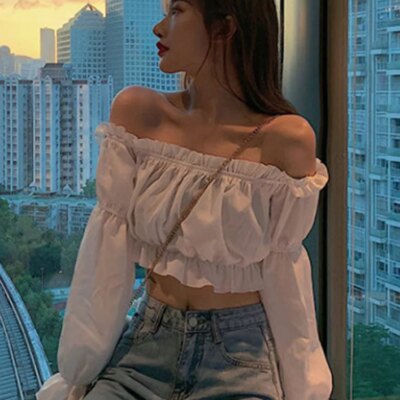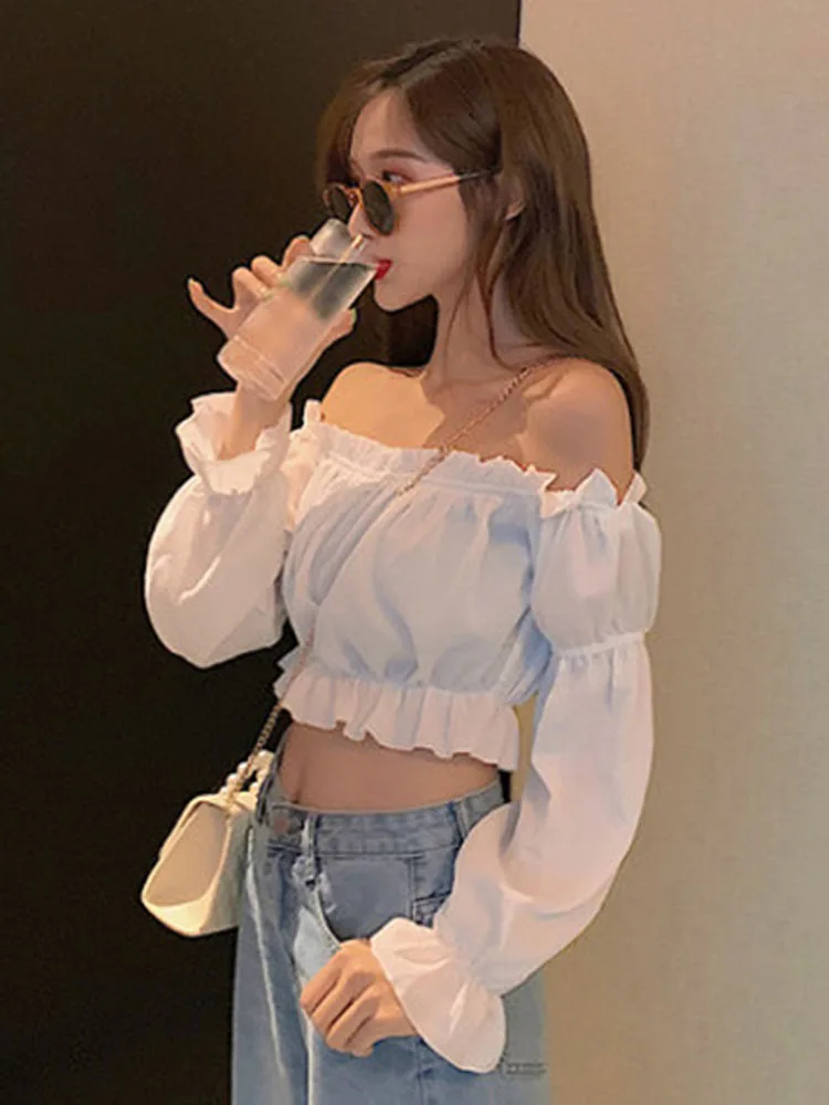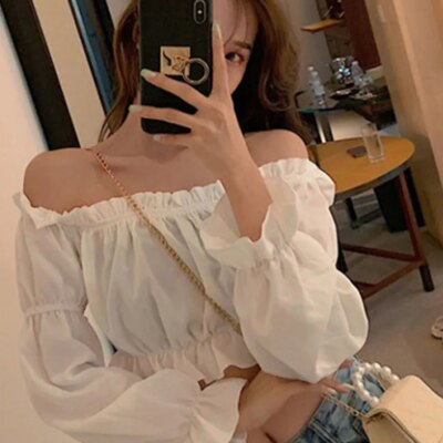 Women Top Sexy Blouse Off Shoulder Top Long Sleeve Solid Color White Shirt Puff Sleeve Ruffle Tunic Crop Top Summer Tube Top