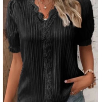 Women’s Summer New Top 2024 Solid Sexy V-Neck Hollow Short Sleeve Shirt Fashion Splice Plus Size Blouse Loose Street Apparel